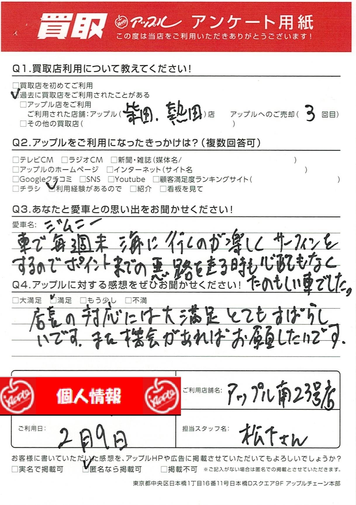 お車のご相談・ 査定だけでもOK! カンタン 入力 30秒 アップルがブランド買取始めました! お電話でも受付中! 受付時間10:00~19:00 052-619-3373 お車のご相談・ 査定だけでもOK! カンタン 入力 30秒 アップルがブランド買取始めました! お電話でも受付中! 受付時間10:00~19:00 052-619-3373 アップルがブランド買取始めました! お電話でも受付中! 受付時間10:00~19:00 052-619-3373 店舗情報 在庫車 スタッフ紹介 ブログ お客様の声 キャンペーン 無料査定 click お客様の声 ご記入日: 2023/02/09 T様 車名:スズキ ジムニー 店長の対応には大満足 とてもすばらしいです。また機会があればお願いしたいです。 前へ 次へ お客様の声一覧を見る
