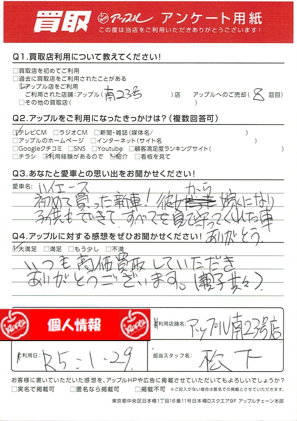 お車のご相談・ 査定だけでもOK! カンタン 入力 30秒 アップルがブランド買取始めました! お電話でも受付中! 受付時間10:00~19:00 052-619-3373 お車のご相談・ 査定だけでもOK! カンタン 入力 30秒 アップルがブランド買取始めました! お電話でも受付中! 受付時間10:00~19:00 052-619-3373 アップルがブランド買取始めました! お電話でも受付中! 受付時間10:00~19:00 052-619-3373 店舗情報 在庫車 スタッフ紹介 ブログ お客様の声 キャンペーン 無料査定 click お客様の声 ご記入日: 2023/01/29 H様 車名:トヨタ ハイエースバン いつも高価買取していただきありがとうございます。(親子共々) 前へ 次へ お客様の声一覧を見る