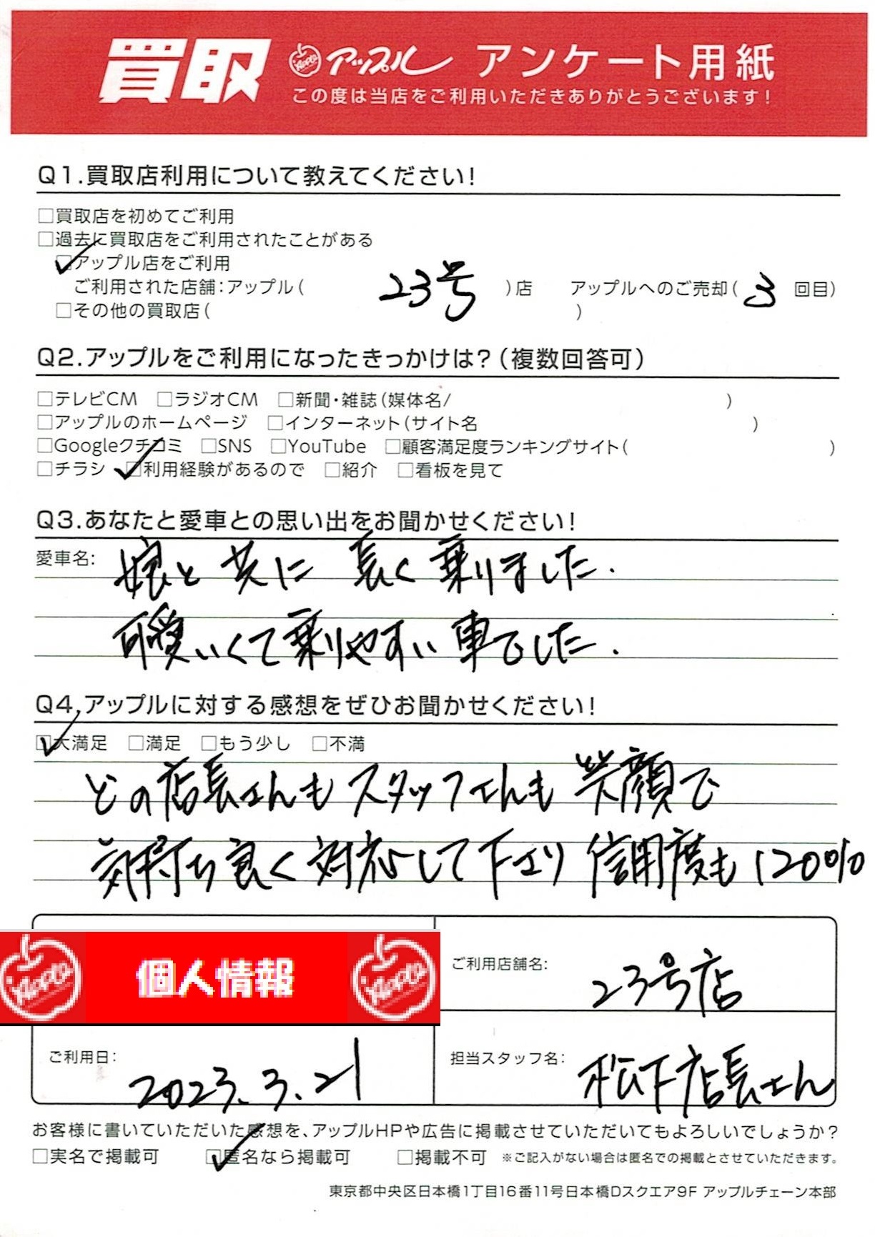 お車のご相談・ 査定だけでもOK! カンタン 入力 30秒 アップルがブランド買取始めました! お電話でも受付中! 受付時間10:00~19:00 052-619-3373 お車のご相談・ 査定だけでもOK! カンタン 入力 30秒 アップルがブランド買取始めました! お電話でも受付中! 受付時間10:00~19:00 052-619-3373 アップルがブランド買取始めました! お電話でも受付中! 受付時間10:00~19:00 052-619-3373 店舗情報 在庫車 スタッフ紹介 ブログ お客様の声 キャンペーン 無料査定 click お客様の声 ご記入日: 2023/03/21 Y様 どの店長さんもスタッフさんも笑顔で気持ち良く対応して下さり信用度も120% 前へ 次へ お客様の声一覧を見る