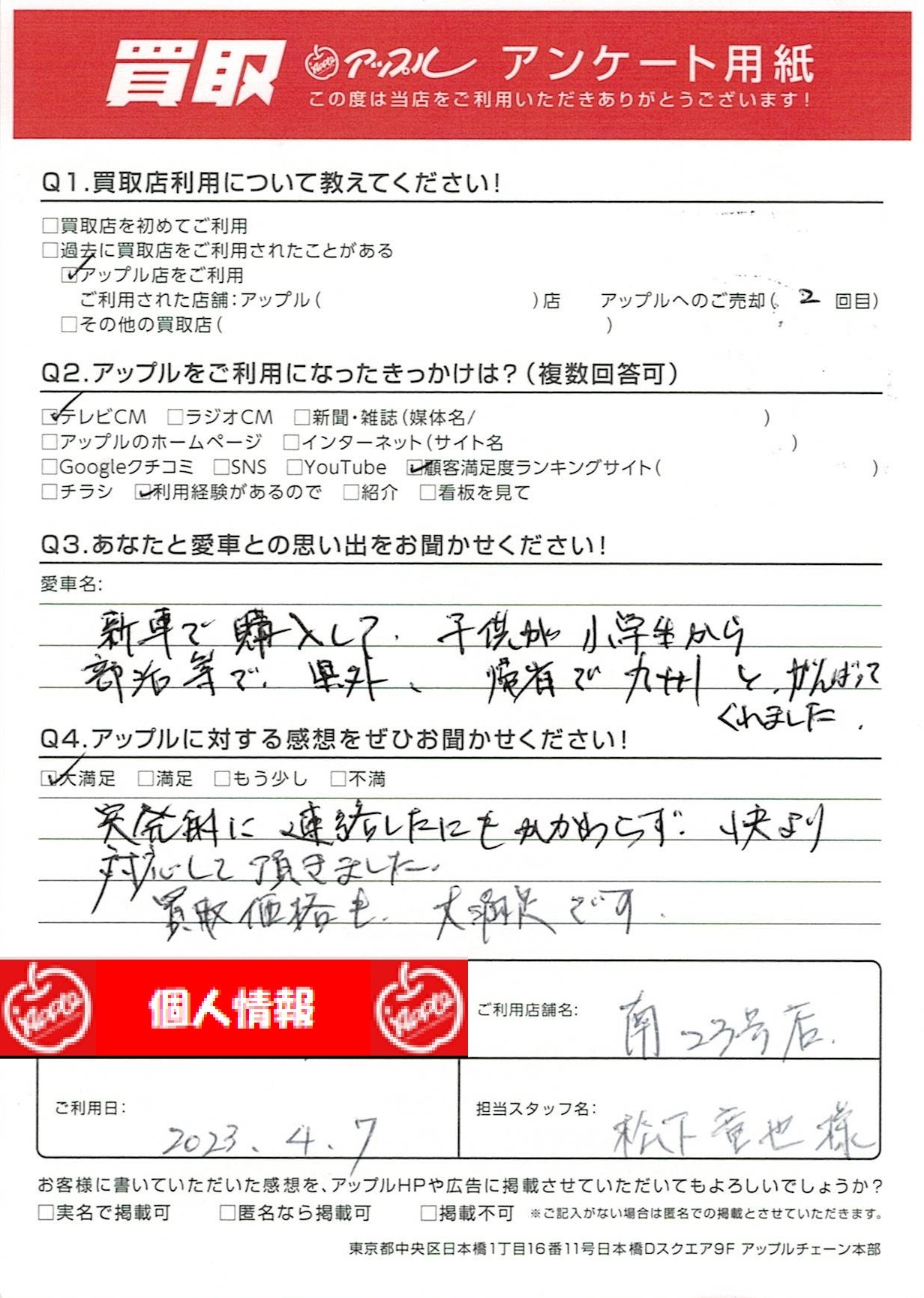 お車のご相談・ 査定だけでもOK! カンタン 入力 30秒 アップルがブランド買取始めました! お電話でも受付中! 受付時間10:00~19:00 052-619-3373 お車のご相談・ 査定だけでもOK! カンタン 入力 30秒 アップルがブランド買取始めました! お電話でも受付中! 受付時間10:00~19:00 052-619-3373 アップルがブランド買取始めました! お電話でも受付中! 受付時間10:00~19:00 052-619-3373 店舗情報 在庫車 スタッフ紹介 ブログ お客様の声 キャンペーン 無料査定 click お客様の声 ご記入日: 2023/04/07 I様 突発的に連絡したにもかかわらず、快よい対応して頂きました。 買取価格も、大満足です。 前へ 次へ お客様の声一覧を見る