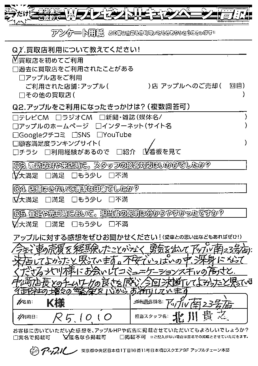 今まで車の売買を経験したことがなく、勇気を出してアップル南23号店に
