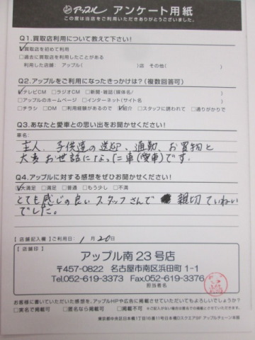 アップル南23号店コメント:思い出の詰まった愛車をご売却頂きありがとうございました。お褒めのお言葉もありがとうございます。