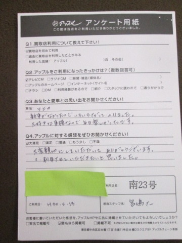 アップル南23号店コメント:大切な愛車のお別れの手伝いをさせていただきありがとうございました。今後ともよろしくお願い致します。