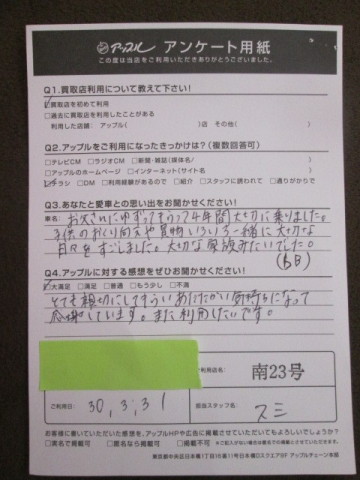 アップル南23号店コメント:家族のように大切にされたお車をお売りいただきありがとうございました。今後も思い出たくさんのお車を手放される際はご相談お待ちしております。