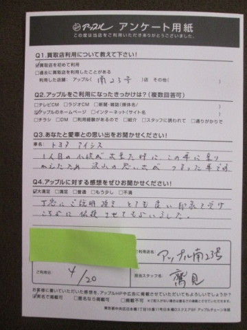 アップル南23号店コメント:たくさんの思い出の詰まった車をお売りいただきありがとうございます。安心してお売りいただけたようでよかったです。今後ともよろしくお願い致します。