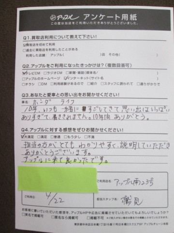 アップル南23号店コメント:長きにわたって活躍された車をお売りいただいてありがとうございます。アップルに来て良かったと思っていただけて嬉しく思います。今後ともよろしくお願い致します。