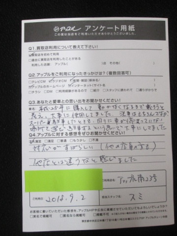 アップルに対する感想:大満足。対応がすばらしい(他の店員の方も)。他店とは違うなと感じました。