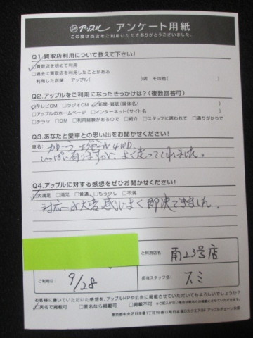 お車のご相談・ 査定だけでもOK! カンタン 入力 30秒 アップルがブランド買取始めました! お電話でも受付中! 受付時間10:00~19:00 052-619-3373 お車のご相談・ 査定だけでもOK! カンタン 入力 30秒 アップルがブランド買取始めました! お電話でも受付中! 受付時間10:00~19:00 052-619-3373 アップルがブランド買取始めました! お電話でも受付中! 受付時間10:00~19:00 052-619-3373 店舗情報 在庫車 スタッフ紹介 ブログ お客様の声 キャンペーン 無料査定 click お客様の声 ご記入日: 2018/09/28 T・K様 愛車:カローララグゼール4WD愛車との思い出:いっぱい有りますが、よく走ってくれました。アップルに対する感想:大満足。対応が大変感じよく即決できました。 前へ 次へ お客様の声一覧を見る
