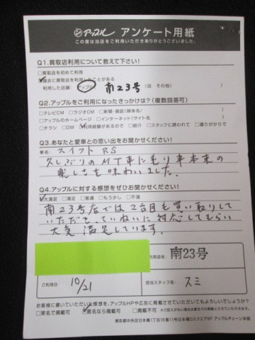 アップルに対する感想:大満足。南23号店では2台目も買い取りしていただき、ていねいに対応してもらい大変満足しています。