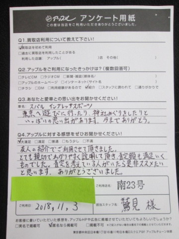 アップルに対する感想:大満足。友人の紹介でご利用させて頂きました。とても親切でわかりやすく説明して頂き、査定額も満足いくものでした。査定を考えている人がいたら是非ススメたいと思います。ありがとうございました。