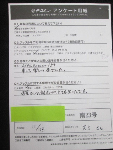 お車のご相談・ 査定だけでもOK! カンタン 入力 30秒 アップルがブランド買取始めました! お電話でも受付中! 受付時間10:00~19:00 052-619-3373 お車のご相談・ 査定だけでもOK! カンタン 入力 30秒 アップルがブランド買取始めました! お電話でも受付中! 受付時間10:00~19:00 052-619-3373 アップルがブランド買取始めました! お電話でも受付中! 受付時間10:00~19:00 052-619-3373 店舗情報 在庫車 スタッフ紹介 ブログ お客様の声 キャンペーン 無料査定 click お客様の声 ご記入日: 2018/11/18 匿名様 愛車:アルファロメオ159愛車との思い出:乗って楽しい車でした。アップルに対する感想:満足。店員さんの対応がとても良かったです。 前へ 次へ お客様の声一覧を見る