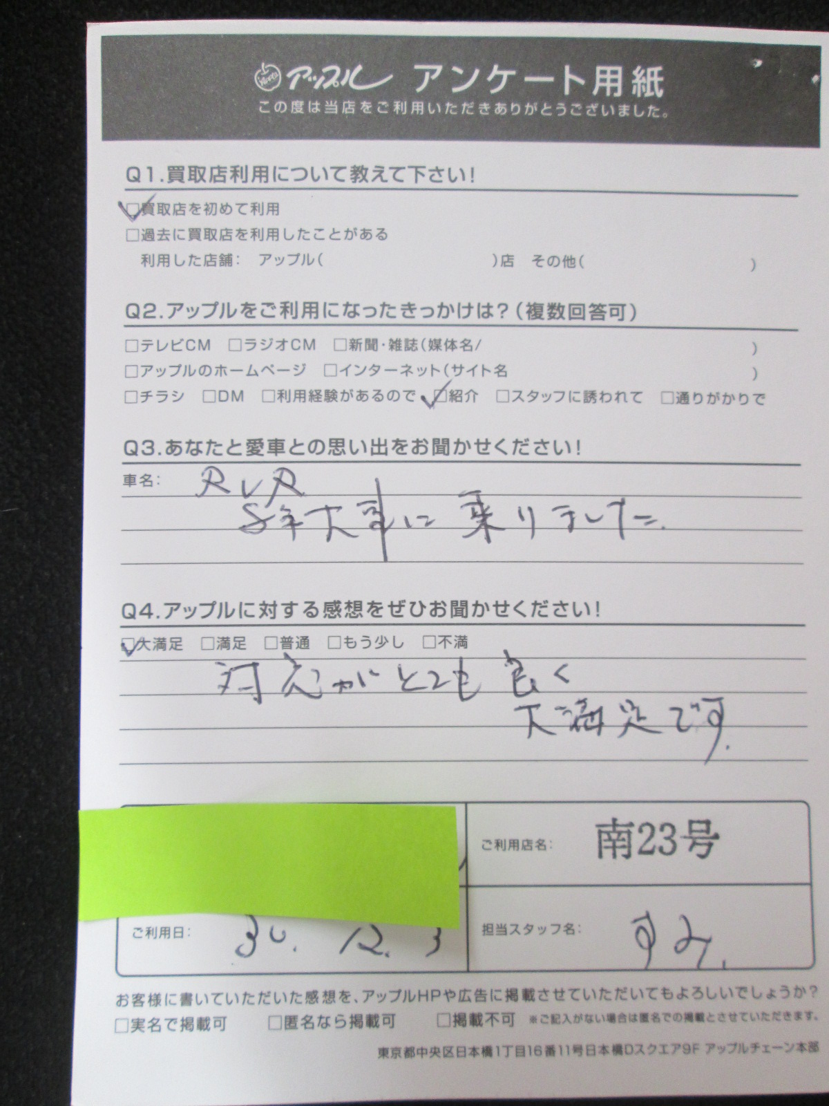 お車のご相談・ 査定だけでもOK! カンタン 入力 30秒 アップルがブランド買取始めました! お電話でも受付中! 受付時間10:00~19:00 052-619-3373 お車のご相談・ 査定だけでもOK! カンタン 入力 30秒 アップルがブランド買取始めました! お電話でも受付中! 受付時間10:00~19:00 052-619-3373 アップルがブランド買取始めました! お電話でも受付中! 受付時間10:00~19:00 052-619-3373 店舗情報 在庫車 スタッフ紹介 ブログ お客様の声 キャンペーン 無料査定 click お客様の声 ご記入日: 2018/12/03 匿名様 車名:三菱 RVR 愛車:RVR愛車との思い出:8年大事に乗りました。アップルに対する感想:大満足。対応がとても良く大満足です。 前へ 次へ お客様の声一覧を見る