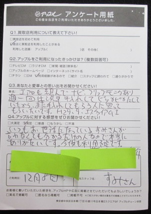 アップルに対する感想:満足。いつもお世話になっているすみさんが言わなくても分かるだけの人なので本当にありがたいです。今後も利用予定です。