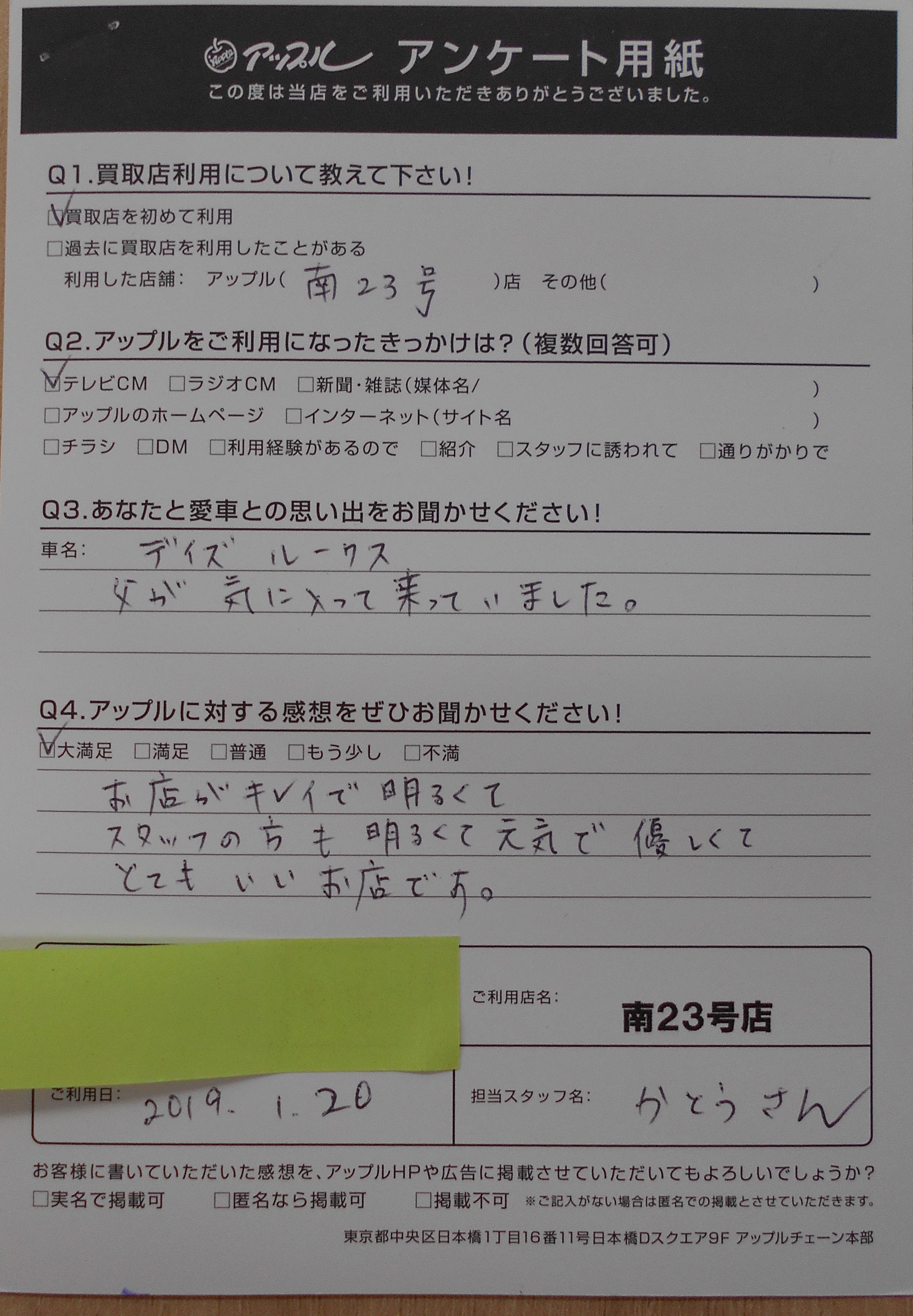 お車のご相談・ 査定だけでもOK! カンタン 入力 30秒 アップルがブランド買取始めました! お電話でも受付中! 受付時間10:00~19:00 052-619-3373 お車のご相談・ 査定だけでもOK! カンタン 入力 30秒 アップルがブランド買取始めました! お電話でも受付中! 受付時間10:00~19:00 052-619-3373 アップルがブランド買取始めました! お電話でも受付中! 受付時間10:00~19:00 052-619-3373 店舗情報 在庫車 スタッフ紹介 ブログ お客様の声 キャンペーン 無料査定 click お客様の声 ご記入日: 2019/01/20 匿名様 車名:日産 デイズルークス 愛車:デイズルークス愛車との思い出:父が気に入って乗っていました。アップルに対する感想:大満足。お店がキレイで明るくて、スタッフの方も明るくて元気で優しくてとてもいいお店です 前へ 次へ お客様の声一覧を見る