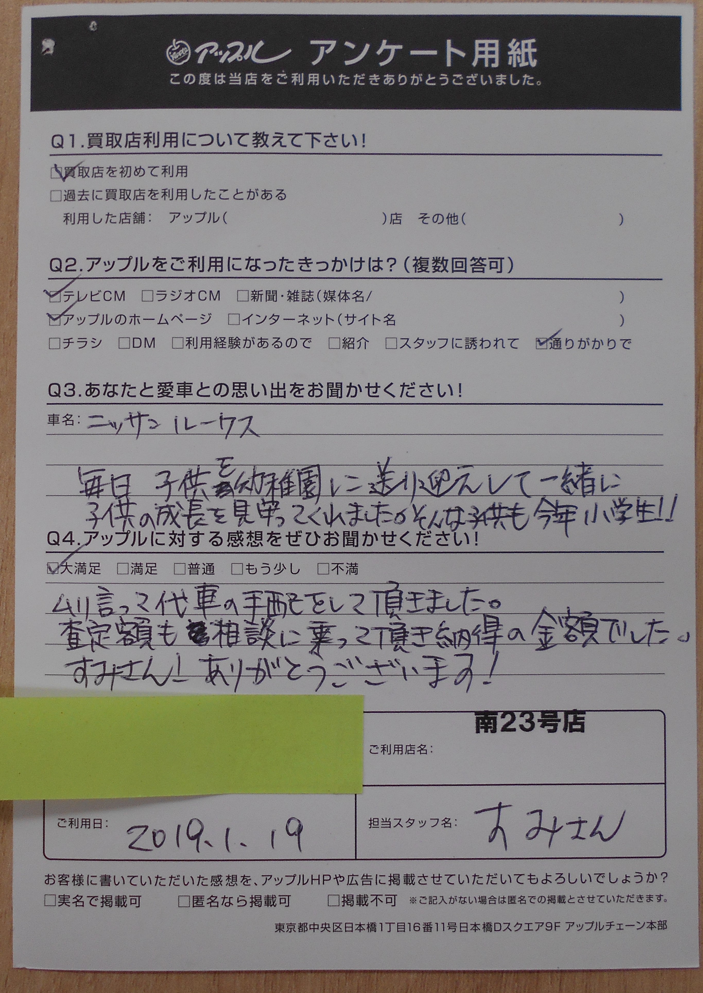 アップルに対する感想:大満足。ムリ言って代車の手配をして頂きました。査定額も相談に乗って頂き納得の金額でした。すみさん!ありがとうございます!
