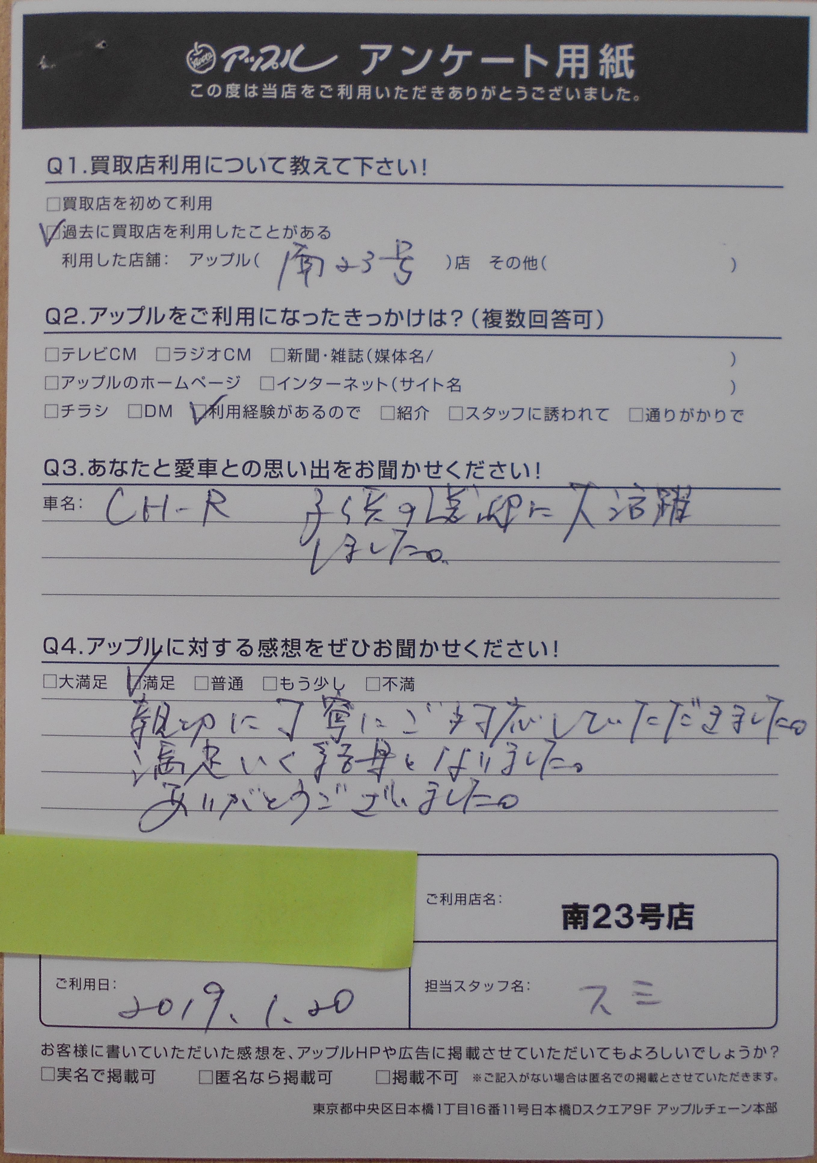 お車のご相談・ 査定だけでもOK! カンタン 入力 30秒 アップルがブランド買取始めました! お電話でも受付中! 受付時間10:00~19:00 052-619-3373 お車のご相談・ 査定だけでもOK! カンタン 入力 30秒 アップルがブランド買取始めました! お電話でも受付中! 受付時間10:00~19:00 052-619-3373 アップルがブランド買取始めました! お電話でも受付中! 受付時間10:00~19:00 052-619-3373 店舗情報 在庫車 スタッフ紹介 ブログ お客様の声 キャンペーン 無料査定 click お客様の声 ご記入日: 2019/01/20 匿名様 車名:トヨタ C-HR 愛車:CH-R愛車との思い出:子供の送迎に大活躍しました。アップルに対する感想:満足。親切に丁寧にご対応していただきました。満足いく結果となりました。ありがとうございました。 前へ 次へ お客様の声一覧を見る