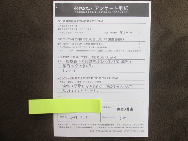 お車のご相談・ 査定だけでもOK! カンタン 入力 30秒 アップルがブランド買取始めました! お電話でも受付中! 受付時間10:00~19:00 052-619-3373 お車のご相談・ 査定だけでもOK! カンタン 入力 30秒 アップルがブランド買取始めました! お電話でも受付中! 受付時間10:00~19:00 052-619-3373 アップルがブランド買取始めました! お電話でも受付中! 受付時間10:00~19:00 052-619-3373 店舗情報 在庫車 スタッフ紹介 ブログ お客様の声 キャンペーン 無料査定 click お客様の声 ご記入日: 2019/03/03 匿名様 車名:スバル レガシィツーリングワゴン 愛車:レガシィ愛車との思い出:結婚前から結婚後までいろいろな場所に旅行に行きました。アップルに対する感想:満足。接客の姿勢がやわらかく、売る側のペースで話しをしていただけた。 前へ 次へ お客様の声一覧を見る