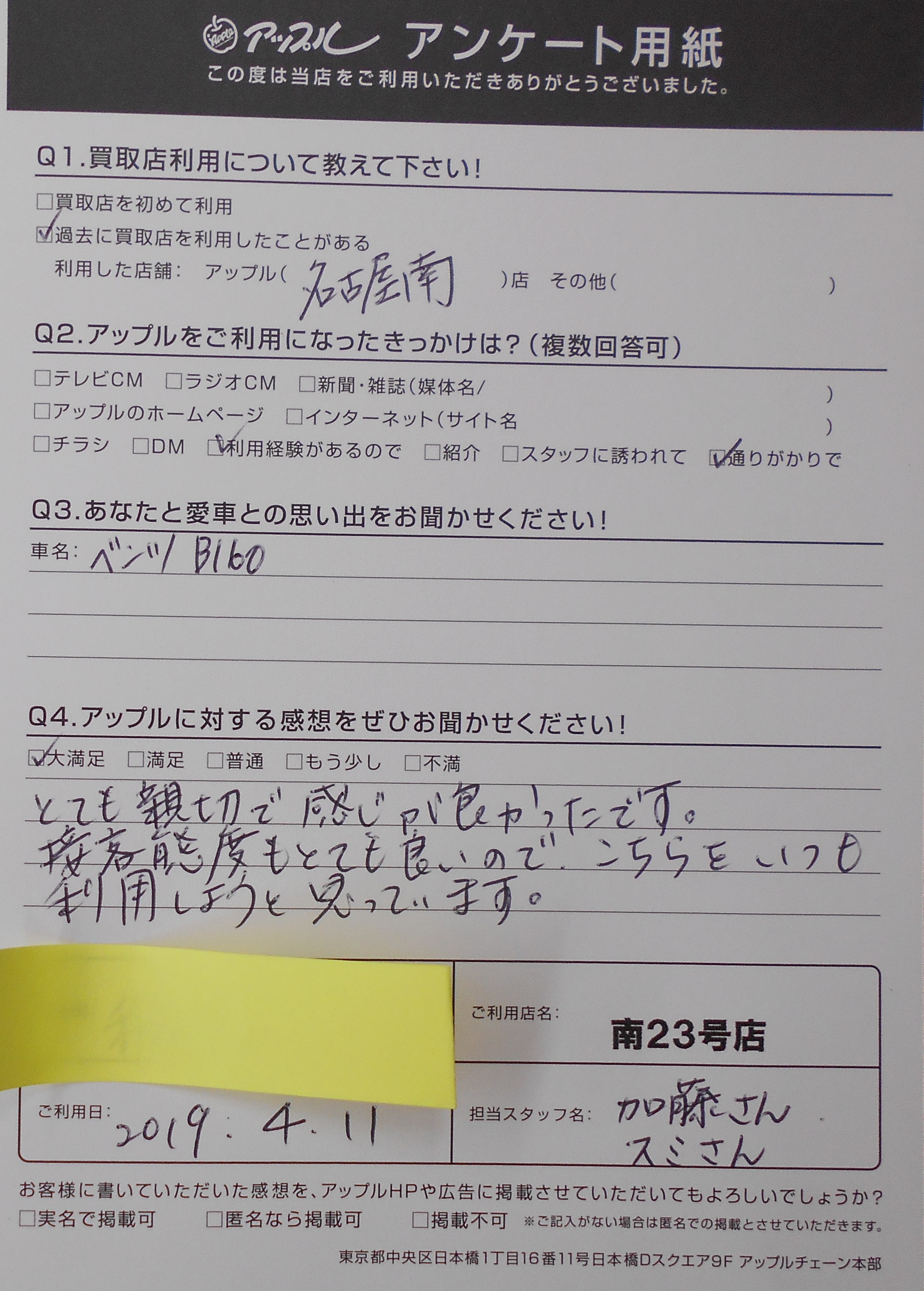 お車のご相談・ 査定だけでもOK! カンタン 入力 30秒 アップルがブランド買取始めました! お電話でも受付中! 受付時間10:00~19:00 052-619-3373 お車のご相談・ 査定だけでもOK! カンタン 入力 30秒 アップルがブランド買取始めました! お電話でも受付中! 受付時間10:00~19:00 052-619-3373 アップルがブランド買取始めました! お電話でも受付中! 受付時間10:00~19:00 052-619-3373 店舗情報 在庫車 スタッフ紹介 ブログ お客様の声 キャンペーン 無料査定 click お客様の声 ご記入日: 2019/04/11 匿名様 車名:メルセデス・ベンツ Bクラス 愛車:ベンツB160アップルに対する感想:大満足。とても親切で感じが良かったです。接客態度もとても良いので、こちらをいつも利用しようと思っています。 前へ 次へ お客様の声一覧を見る