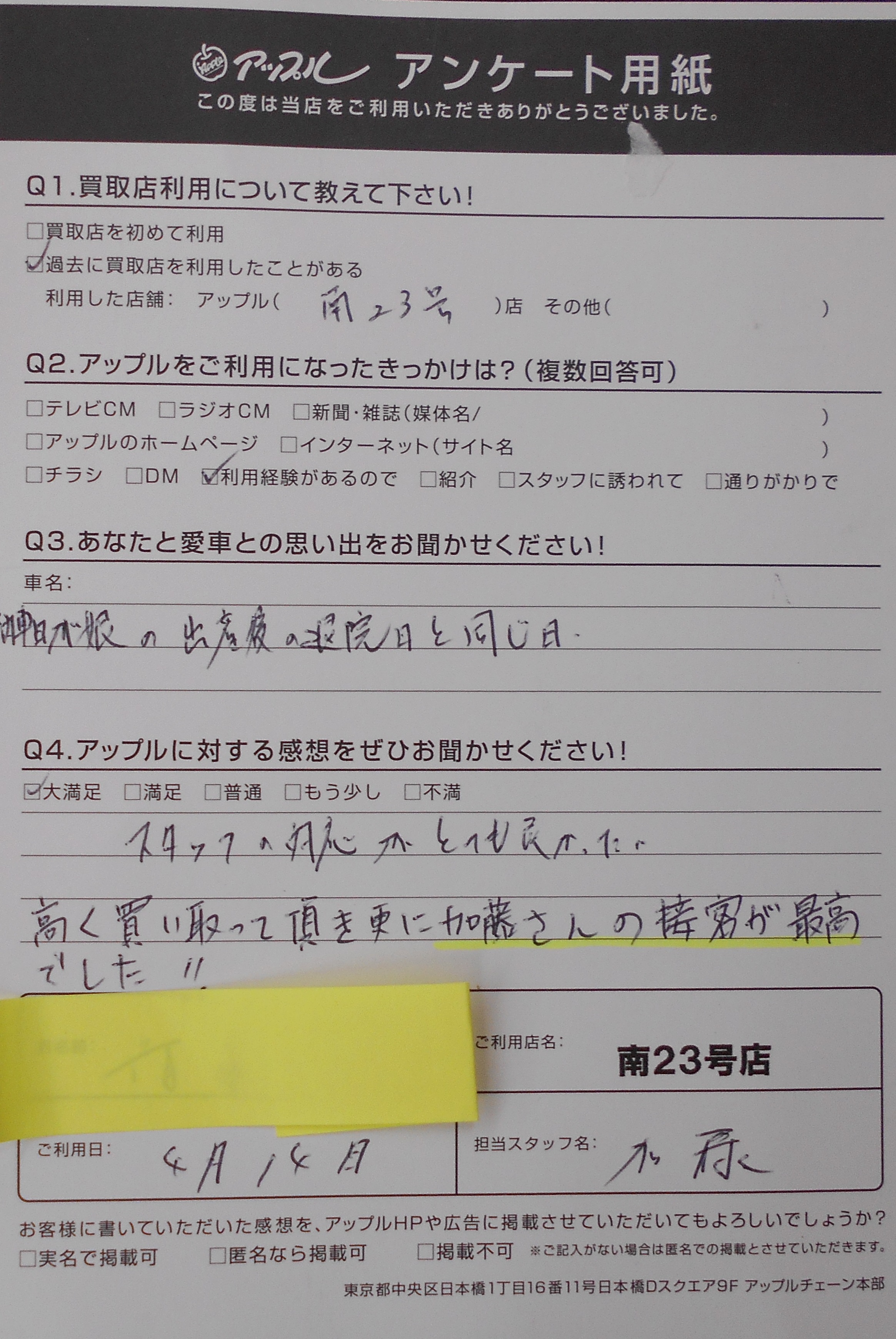 お車のご相談・ 査定だけでもOK! カンタン 入力 30秒 アップルがブランド買取始めました! お電話でも受付中! 受付時間10:00~19:00 052-619-3373 お車のご相談・ 査定だけでもOK! カンタン 入力 30秒 アップルがブランド買取始めました! お電話でも受付中! 受付時間10:00~19:00 052-619-3373 アップルがブランド買取始めました! お電話でも受付中! 受付時間10:00~19:00 052-619-3373 店舗情報 在庫車 スタッフ紹介 ブログ お客様の声 キャンペーン 無料査定 click お客様の声 ご記入日: 2019/04/14 匿名様 車名:トヨタ アルファード(H27年1月~のHYBRID含む) 愛車との思い出:納車日が娘の出産後の退院日と同じ日アップルに対する感想:大満足。スタッフの対応がとても良かった。高く買い取って頂き更に加藤さんの接客が最高でした!! 前へ 次へ お客様の声一覧を見る
