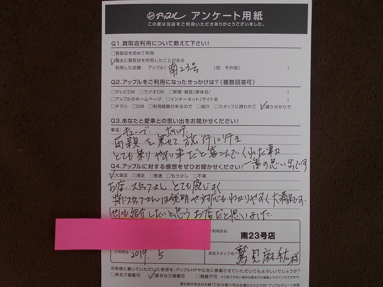 愛車との思い出:両親を乗せて旅行に行き、とても乗りやすい車だと喜こんでくれた事が一番の思い出です。