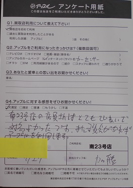 お車のご相談・ 査定だけでもOK! カンタン 入力 30秒 アップルがブランド買取始めました! お電話でも受付中! 受付時間10:00~19:00 052-619-3373 お車のご相談・ 査定だけでもOK! カンタン 入力 30秒 アップルがブランド買取始めました! お電話でも受付中! 受付時間10:00~19:00 052-619-3373 アップルがブランド買取始めました! お電話でも受付中! 受付時間10:00~19:00 052-619-3373 店舗情報 在庫車 スタッフ紹介 ブログ お客様の声 キャンペーン 無料査定 click お客様の声 ご記入日: 2019/07/27 匿名様 車名:トヨタ 86 アップルに対する感想:大満足。南23号店の店員さんはとてもていねいで対応よかったです。また機会があればアップルを利用します。 前へ 次へ お客様の声一覧を見る