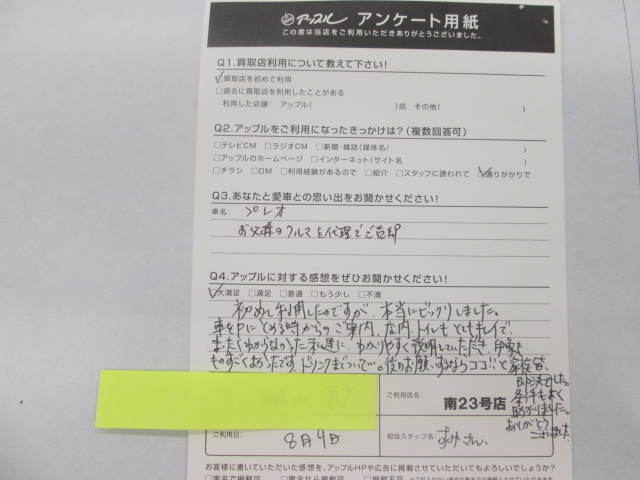 アップルに対する感想:大満足。初めて利用したのですが、本当にビックリしました。車をPにとめる時からのご案内、店内、トイレもとてもキレイで、まったくわからなかった私達にわかりやすく説明していただき、印象もものすごくよかったです。ドリンクまでついて・・・。後日お願いするならココ!!と家族皆、即決でした。条件もよく助かりました。ありがとうございました。