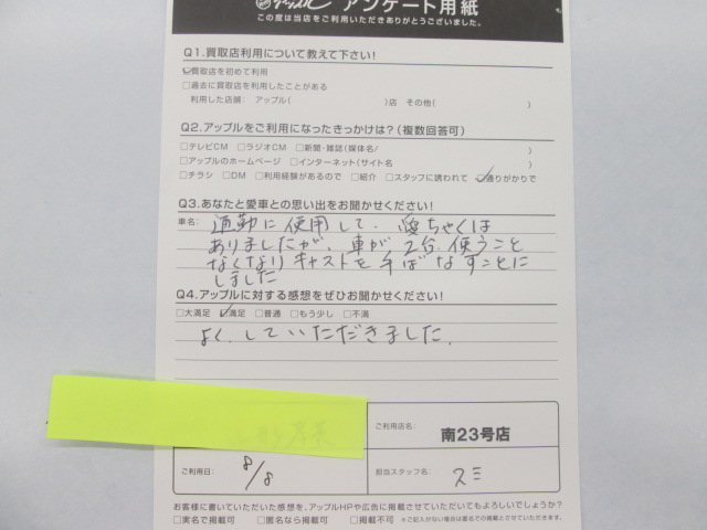 お車のご相談・ 査定だけでもOK! カンタン 入力 30秒 アップルがブランド買取始めました! お電話でも受付中! 受付時間10:00~19:00 052-619-3373 お車のご相談・ 査定だけでもOK! カンタン 入力 30秒 アップルがブランド買取始めました! お電話でも受付中! 受付時間10:00~19:00 052-619-3373 アップルがブランド買取始めました! お電話でも受付中! 受付時間10:00~19:00 052-619-3373 店舗情報 在庫車 スタッフ紹介 ブログ お客様の声 キャンペーン 無料査定 click お客様の声 ご記入日: 2019/08/08 匿名様 車名:ダイハツ キャスト 通勤に使用して愛着はありましたが、車が2台使うことなくなりキャストを手放す事にしました。良くしていただきました。 前へ 次へ お客様の声一覧を見る
