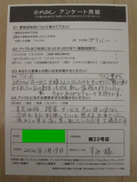 アップルに対する感想:大満足。査定価格、接客。サービス共に申し分なく、次回もまた利用したいと思えるお店でした。傷ありの車を高く買い取っていただき大満足です。