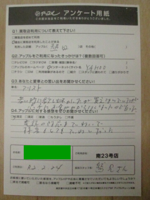 アップルに対する感想:大満足。電話の対応もていねいで接客もとてもていねいだった。
