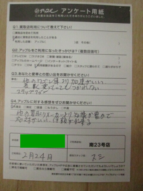 お車のご相談・ 査定だけでもOK! カンタン 入力 30秒 アップルがブランド買取始めました! お電話でも受付中! 受付時間10:00~19:00 052-619-3373 お車のご相談・ 査定だけでもOK! カンタン 入力 30秒 アップルがブランド買取始めました! お電話でも受付中! 受付時間10:00~19:00 052-619-3373 アップルがブランド買取始めました! お電話でも受付中! 受付時間10:00~19:00 052-619-3373 店舗情報 在庫車 スタッフ紹介 ブログ お客様の声 キャンペーン 無料査定 click お客様の声 ご記入日: 2020/02/24 匿名様 車名:ホンダ ステップワゴン 愛車:ステップワゴン愛車との思い出:他のワゴン車より加速がいい。長く乗っていてもつかれないアップルに対する感想:大満足。他の買取りメーカーより知識が豊かで応対がいい、信頼が出来る。 前へ 次へ お客様の声一覧を見る