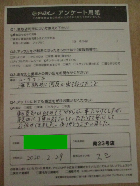 アップルに対する感想:大満足。車の売却は初めてで分からない事だらけでしたが、親切に、丁寧に対応していただけて安心してお任せできました。ありがとうございました。