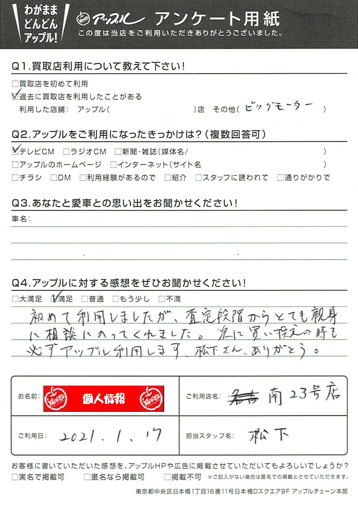 お車のご相談・ 査定だけでもOK! カンタン 入力 30秒 アップルがブランド買取始めました! お電話でも受付中! 受付時間10:00~19:00 052-619-3373 お車のご相談・ 査定だけでもOK! カンタン 入力 30秒 アップルがブランド買取始めました! お電話でも受付中! 受付時間10:00~19:00 052-619-3373 アップルがブランド買取始めました! お電話でも受付中! 受付時間10:00~19:00 052-619-3373 店舗情報 在庫車 スタッフ紹介 ブログ お客様の声 キャンペーン 無料査定 click お客様の声 ご記入日: 2021/01/17 匿名様 車名:BMW 3シリーズセダン 初めて利用しましたが、査定段階からとても親身に相談にのってくれました。次に買い換えの時も必ずアップル利用します。松下さんありがとう。 前へ 次へ お客様の声一覧を見る