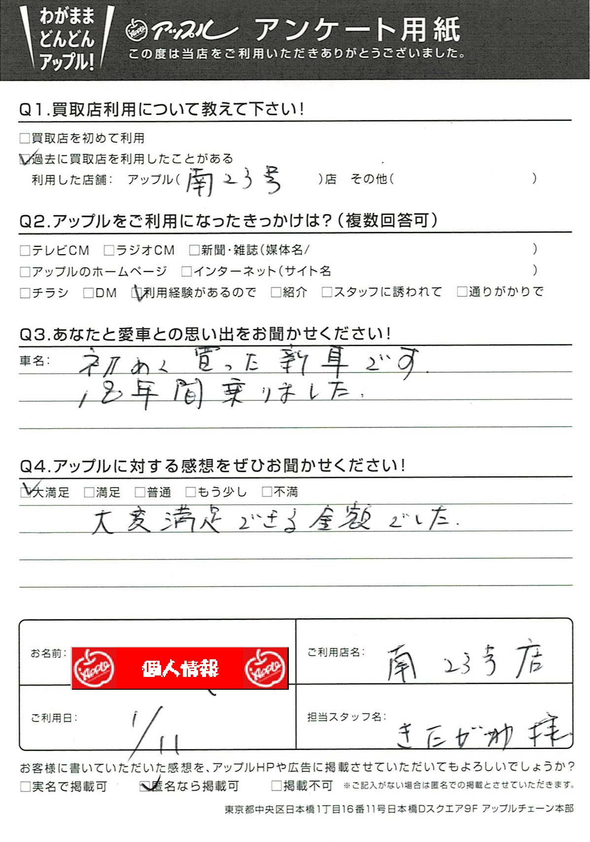 お車のご相談・ 査定だけでもOK! カンタン 入力 30秒 アップルがブランド買取始めました! お電話でも受付中! 受付時間10:00~19:00 052-619-3373 お車のご相談・ 査定だけでもOK! カンタン 入力 30秒 アップルがブランド買取始めました! お電話でも受付中! 受付時間10:00~19:00 052-619-3373 アップルがブランド買取始めました! お電話でも受付中! 受付時間10:00~19:00 052-619-3373 店舗情報 在庫車 スタッフ紹介 ブログ お客様の声 キャンペーン 無料査定 click お客様の声 ご記入日: 2021/01/11 匿名様 車名:日産 ステージア 大変満足できる金額でした。 前へ 次へ お客様の声一覧を見る