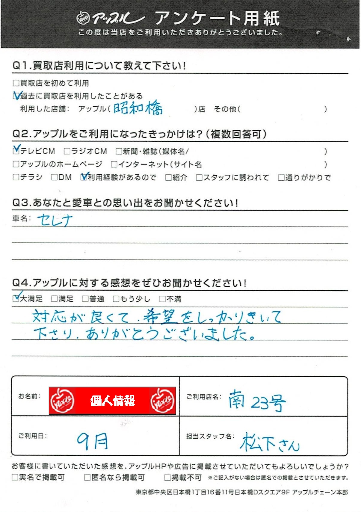 お車のご相談・ 査定だけでもOK! カンタン 入力 30秒 アップルがブランド買取始めました! お電話でも受付中! 受付時間10:00~19:00 052-619-3373 お車のご相談・ 査定だけでもOK! カンタン 入力 30秒 アップルがブランド買取始めました! お電話でも受付中! 受付時間10:00~19:00 052-619-3373 アップルがブランド買取始めました! お電話でも受付中! 受付時間10:00~19:00 052-619-3373 店舗情報 在庫車 スタッフ紹介 ブログ お客様の声 キャンペーン 無料査定 click お客様の声 ご記入日: 2020/09/28 匿名様 車名:日産 セレナ 対応が良くて、希望をしっかりきいて下さり、ありがとうございました。 前へ 次へ お客様の声一覧を見る