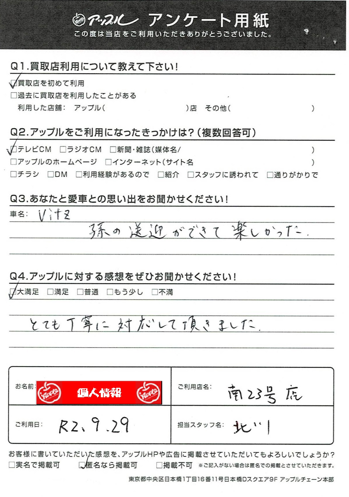 お車のご相談・ 査定だけでもOK! カンタン 入力 30秒 アップルがブランド買取始めました! お電話でも受付中! 受付時間10:00~19:00 052-619-3373 お車のご相談・ 査定だけでもOK! カンタン 入力 30秒 アップルがブランド買取始めました! お電話でも受付中! 受付時間10:00~19:00 052-619-3373 アップルがブランド買取始めました! お電話でも受付中! 受付時間10:00~19:00 052-619-3373 店舗情報 在庫車 スタッフ紹介 ブログ お客様の声 キャンペーン 無料査定 click お客様の声 ご記入日: 2020/09/29 匿名様 車名:トヨタ ヴィッツ とても丁寧に対応して頂きました。 前へ 次へ お客様の声一覧を見る