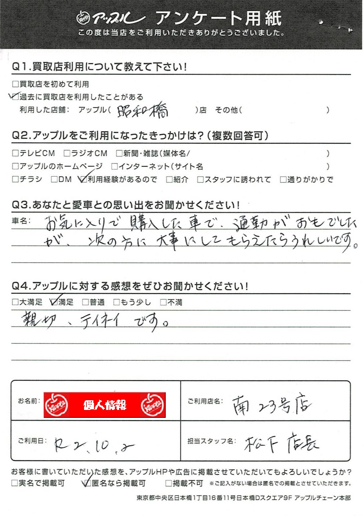 お車のご相談・ 査定だけでもOK! カンタン 入力 30秒 アップルがブランド買取始めました! お電話でも受付中! 受付時間10:00~19:00 052-619-3373 お車のご相談・ 査定だけでもOK! カンタン 入力 30秒 アップルがブランド買取始めました! お電話でも受付中! 受付時間10:00~19:00 052-619-3373 アップルがブランド買取始めました! お電話でも受付中! 受付時間10:00~19:00 052-619-3373 店舗情報 在庫車 スタッフ紹介 ブログ お客様の声 キャンペーン 無料査定 click お客様の声 ご記入日: 2020/10/02 匿名様 車名:トヨタ パッソ 親切、テイネイです。 前へ 次へ お客様の声一覧を見る