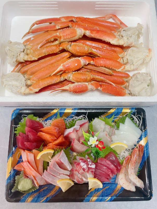 今年は近所にあるお魚屋さん(魚屋桃太郎)でカニとお刺身を予約しました。
