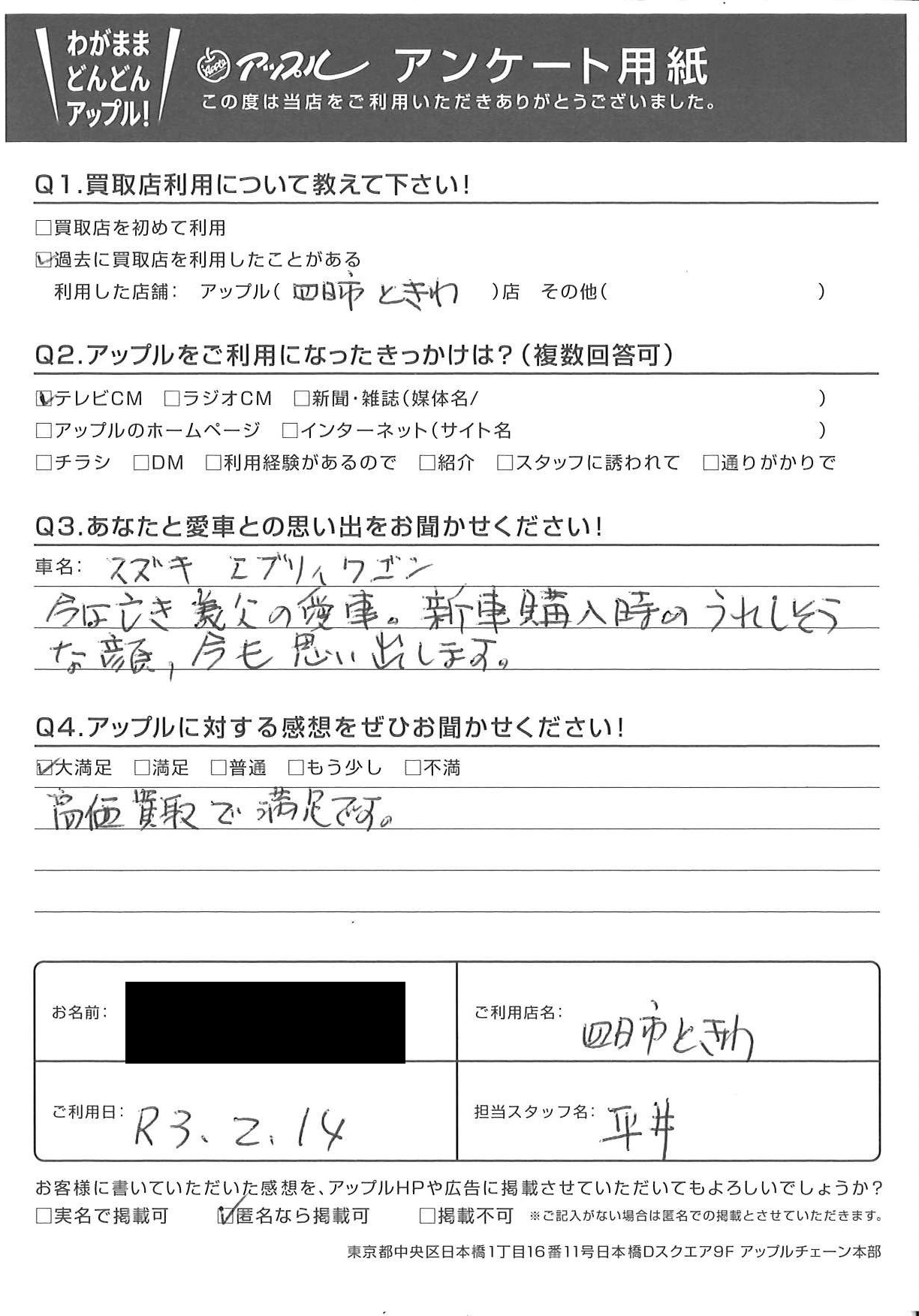 お車のご相談・ 査定だけでもOK! カンタン 入力 30秒 アップルがブランド買取始めました! お電話でも受付中! 受付時間10:00 ~ 18:30 0120-174-177 お車のご相談・ 査定だけでもOK! カンタン 入力 30秒 アップルがブランド買取始めました! お電話でも受付中! 受付時間10:00 ~ 18:30 0120-174-177 アップルがブランド買取始めました! お電話でも受付中! 受付時間10:00 ~ 18:30 0120-174-177 店舗情報 在庫車 スタッフ紹介 ブログ お客様の声 キャンペーン お得 無料査定 click お客様の声 ご記入日: 2021/02/14 Y様 車名:スズキ エブリイワゴン 高価買取で満足です。 前へ 次へ お客様の声一覧を見る