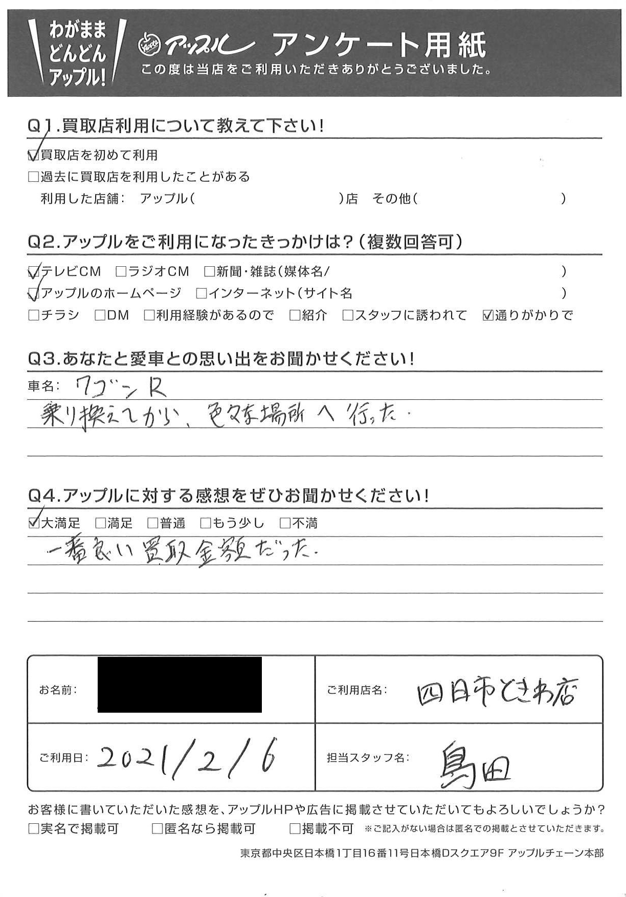 お車のご相談・ 査定だけでもOK! カンタン 入力 30秒 アップルがブランド買取始めました! お電話でも受付中! 受付時間10:00 ~ 18:30 0120-174-177 お車のご相談・ 査定だけでもOK! カンタン 入力 30秒 アップルがブランド買取始めました! お電話でも受付中! 受付時間10:00 ~ 18:30 0120-174-177 アップルがブランド買取始めました! お電話でも受付中! 受付時間10:00 ~ 18:30 0120-174-177 店舗情報 在庫車 スタッフ紹介 ブログ お客様の声 キャンペーン お得 無料査定 click お客様の声 ご記入日: 2021/02/06 Y様 車名:スズキ ワゴンR 一番良い買取金額だった。 前へ 次へ お客様の声一覧を見る