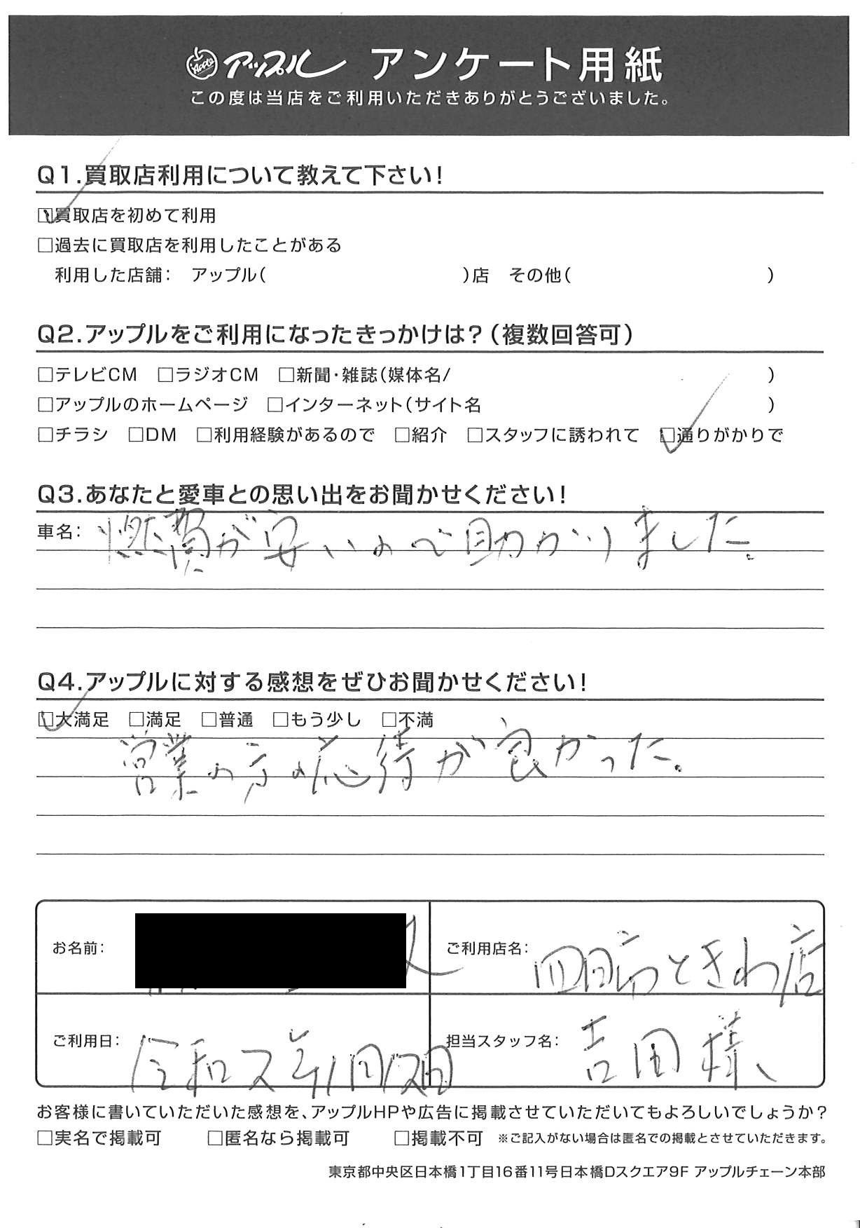 お車のご相談・ 査定だけでもOK! カンタン 入力 30秒 アップルがブランド買取始めました! お電話でも受付中! 受付時間10:00 ~ 18:30 0120-174-177 お車のご相談・ 査定だけでもOK! カンタン 入力 30秒 アップルがブランド買取始めました! お電話でも受付中! 受付時間10:00 ~ 18:30 0120-174-177 アップルがブランド買取始めました! お電話でも受付中! 受付時間10:00 ~ 18:30 0120-174-177 店舗情報 在庫車 スタッフ紹介 ブログ お客様の声 キャンペーン お得 無料査定 click お客様の声 ご記入日: 2021/01/12 M様 車名:トヨタ プリウス(2023年3月~のPHVを含む) 営業の方の応待が良かった。 前へ 次へ お客様の声一覧を見る
