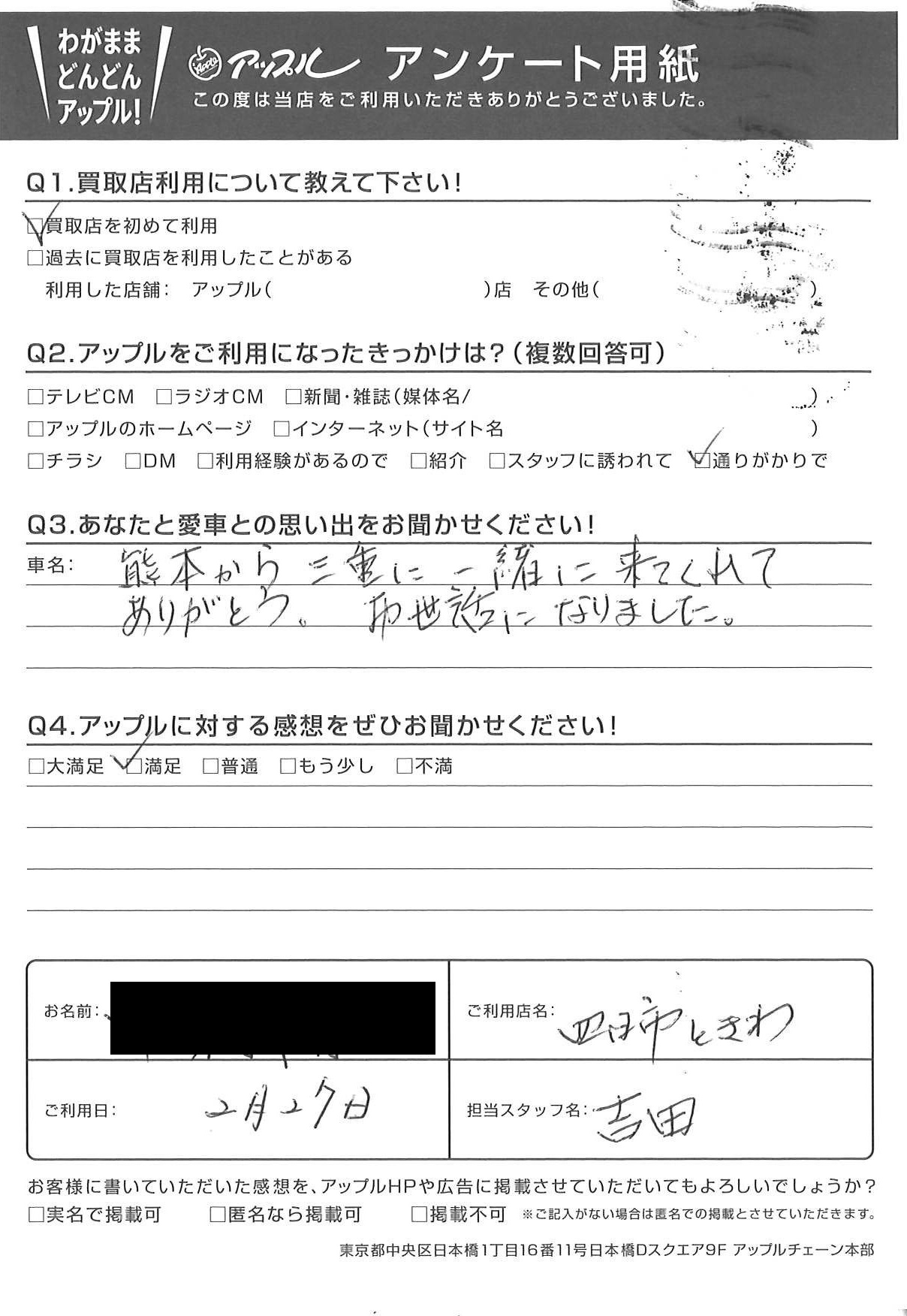 お車のご相談・ 査定だけでもOK! カンタン 入力 30秒 アップルがブランド買取始めました! お電話でも受付中! 受付時間10:00 ~ 18:30 0120-174-177 お車のご相談・ 査定だけでもOK! カンタン 入力 30秒 アップルがブランド買取始めました! お電話でも受付中! 受付時間10:00 ~ 18:30 0120-174-177 アップルがブランド買取始めました! お電話でも受付中! 受付時間10:00 ~ 18:30 0120-174-177 店舗情報 在庫車 スタッフ紹介 ブログ お客様の声 キャンペーン お得 無料査定 click お客様の声 ご記入日: 2021/02/27 N様 車名:ホンダ N-WGN 熊本から三重に一緒に来てくれてありがとう。 お世話になりました。 前へ 次へ お客様の声一覧を見る