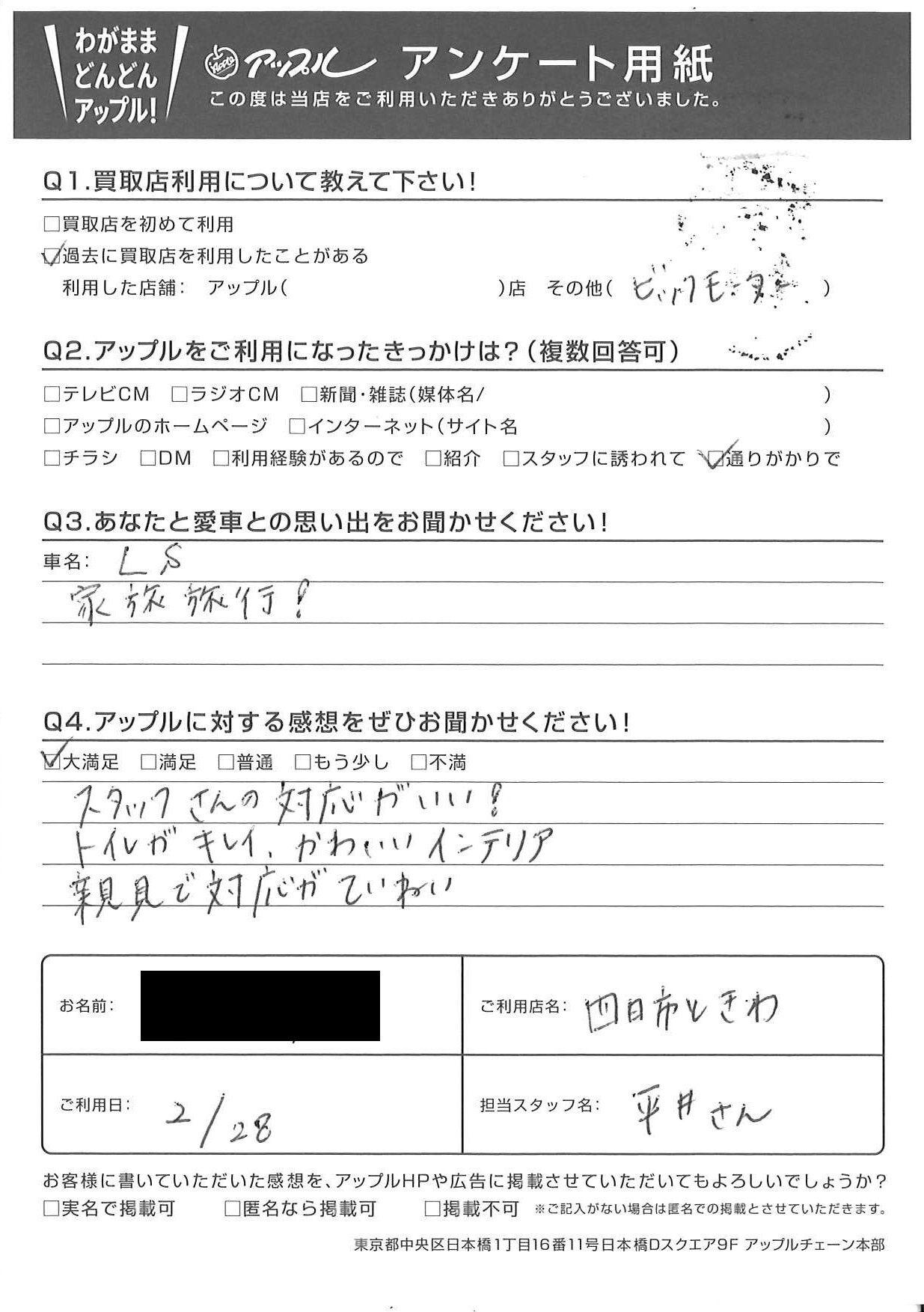 お車のご相談・ 査定だけでもOK! カンタン 入力 30秒 アップルがブランド買取始めました! お電話でも受付中! 受付時間10:00 ~ 18:30 0120-174-177 お車のご相談・ 査定だけでもOK! カンタン 入力 30秒 アップルがブランド買取始めました! お電話でも受付中! 受付時間10:00 ~ 18:30 0120-174-177 アップルがブランド買取始めました! お電話でも受付中! 受付時間10:00 ~ 18:30 0120-174-177 店舗情報 在庫車 スタッフ紹介 ブログ お客様の声 キャンペーン お得 無料査定 click お客様の声 ご記入日: 2021/02/28 H様 車名:レクサス LS (国内仕様 右H H29年10月~HYBRID含) スタッフさんの対応がいい!トイレがキレイ、かわいいインテリア親身で対応がていねい 前へ 次へ お客様の声一覧を見る