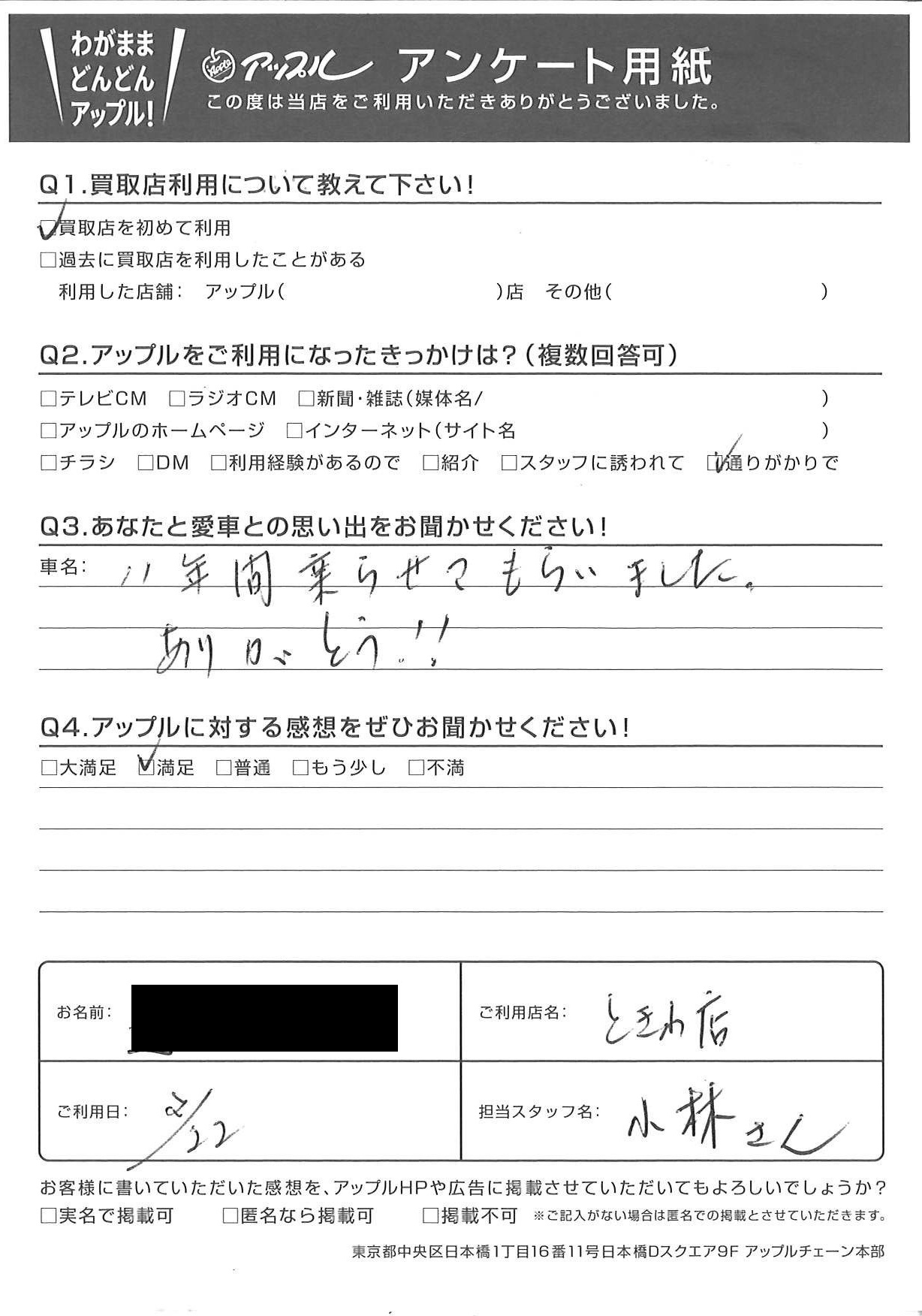 お車のご相談・ 査定だけでもOK! カンタン 入力 30秒 アップルがブランド買取始めました! お電話でも受付中! 受付時間10:00 ~ 18:30 0120-174-177 お車のご相談・ 査定だけでもOK! カンタン 入力 30秒 アップルがブランド買取始めました! お電話でも受付中! 受付時間10:00 ~ 18:30 0120-174-177 アップルがブランド買取始めました! お電話でも受付中! 受付時間10:00 ~ 18:30 0120-174-177 店舗情報 在庫車 スタッフ紹介 ブログ お客様の声 キャンペーン お得 無料査定 click お客様の声 ご記入日: 2021/02/22 S様 車名:トヨタ ヴァンガード 11年間乗らせてもらいました。ありがとう!! 前へ 次へ お客様の声一覧を見る
