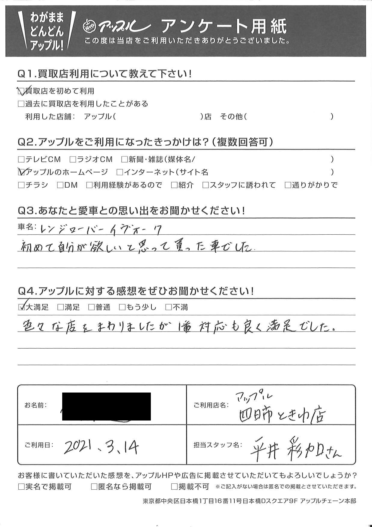 お車のご相談・ 査定だけでもOK! カンタン 入力 30秒 アップルがブランド買取始めました! お電話でも受付中! 受付時間10:00 ~ 18:30 0120-174-177 お車のご相談・ 査定だけでもOK! カンタン 入力 30秒 アップルがブランド買取始めました! お電話でも受付中! 受付時間10:00 ~ 18:30 0120-174-177 アップルがブランド買取始めました! お電話でも受付中! 受付時間10:00 ~ 18:30 0120-174-177 店舗情報 在庫車 スタッフ紹介 ブログ お客様の声 キャンペーン お得 無料査定 click お客様の声 ご記入日: 2021/03/14 I様 車名:ランドローバー レンジローバーイヴォーク 色々な店をまわりましたが1番対応も良く満足でした。 前へ 次へ お客様の声一覧を見る