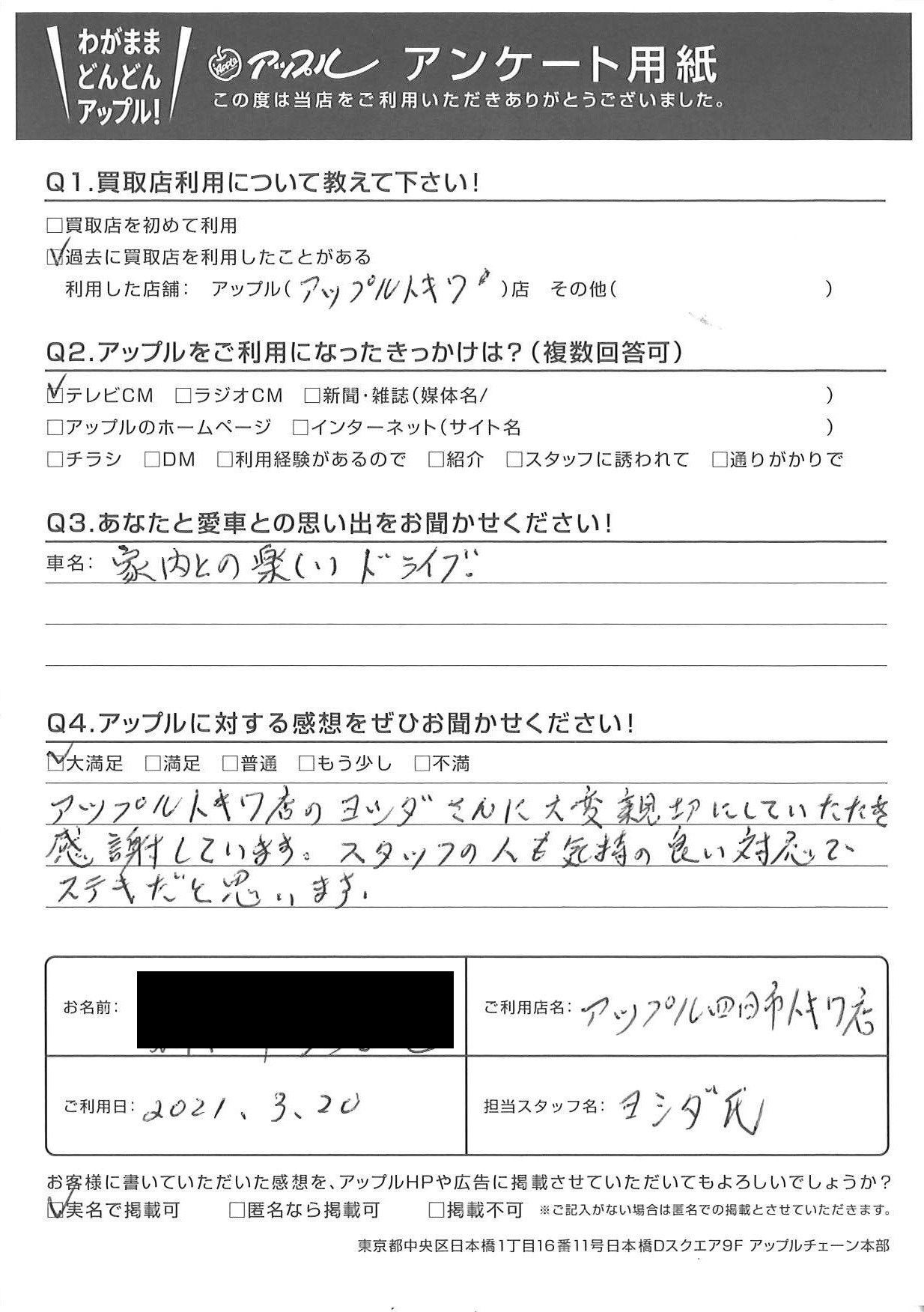 お車のご相談・ 査定だけでもOK! カンタン 入力 30秒 アップルがブランド買取始めました! お電話でも受付中! 受付時間10:00 ~ 18:30 0120-174-177 お車のご相談・ 査定だけでもOK! カンタン 入力 30秒 アップルがブランド買取始めました! お電話でも受付中! 受付時間10:00 ~ 18:30 0120-174-177 アップルがブランド買取始めました! お電話でも受付中! 受付時間10:00 ~ 18:30 0120-174-177 店舗情報 在庫車 スタッフ紹介 ブログ お客様の声 キャンペーン お得 無料査定 click お客様の声 ご記入日: 2021/03/20 Y様 車名:ホンダ N-BOX アップルトキワ店のヨシダさんに大変親切にしていただき感謝しています。スタッフの人も気持の良い対応でステキだと思います。 前へ 次へ お客様の声一覧を見る