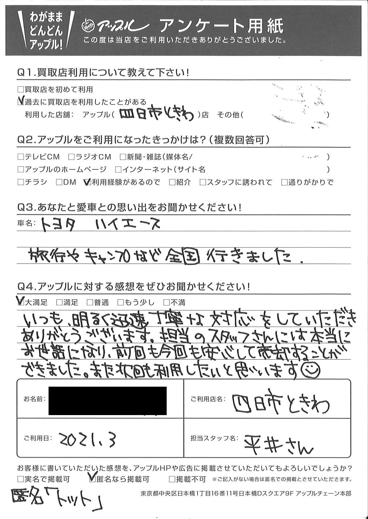 お車のご相談・ 査定だけでもOK! カンタン 入力 30秒 アップルがブランド買取始めました! お電話でも受付中! 受付時間10:00 ~ 18:30 0120-174-177 お車のご相談・ 査定だけでもOK! カンタン 入力 30秒 アップルがブランド買取始めました! お電話でも受付中! 受付時間10:00 ~ 18:30 0120-174-177 アップルがブランド買取始めました! お電話でも受付中! 受付時間10:00 ~ 18:30 0120-174-177 店舗情報 在庫車 スタッフ紹介 ブログ お客様の声 キャンペーン お得 無料査定 click お客様の声 ご記入日: 2021/03/01 トット様 車名:トヨタ ハイエースバン いつも、明るく迅速丁寧な対応をしていただきありがとうございます。担当のスタッフさんには本当にお世話になり、前回も今回も安心して売却することができました。また次回も利用したいと思います 前へ 次へ お客様の声一覧を見る