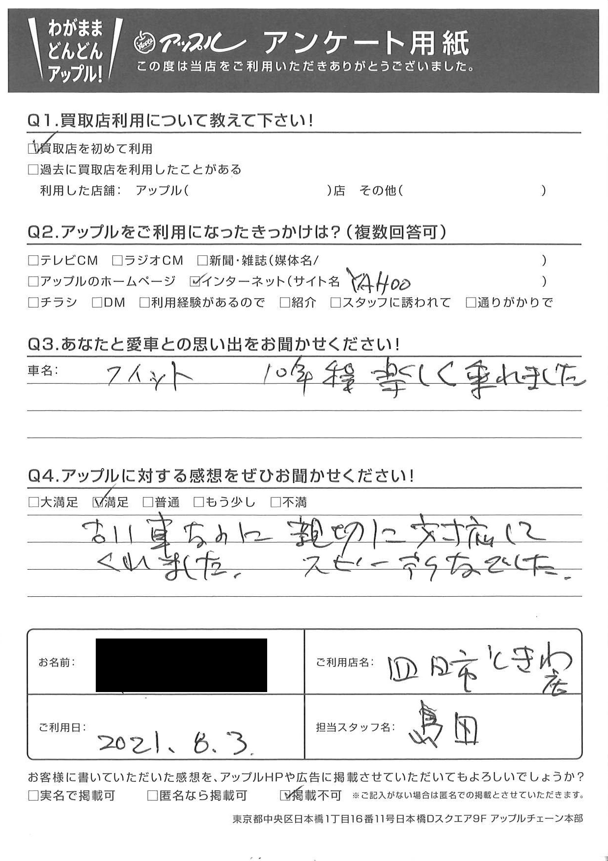 お車のご相談・ 査定だけでもOK! カンタン 入力 30秒 アップルがブランド買取始めました! お電話でも受付中! 受付時間10:00 ~ 18:30 0120-174-177 お車のご相談・ 査定だけでもOK! カンタン 入力 30秒 アップルがブランド買取始めました! お電話でも受付中! 受付時間10:00 ~ 18:30 0120-174-177 アップルがブランド買取始めました! お電話でも受付中! 受付時間10:00 ~ 18:30 0120-174-177 店舗情報 在庫車 スタッフ紹介 ブログ お客様の声 キャンペーン お得 無料査定 click お客様の声 ご記入日: 2021/08/03 M様 車名:ホンダ フィット(H25年9月以降のハイブリッド含む) 古い車なのに親切に対応してくれました。 スピーディーでした。 前へ 次へ お客様の声一覧を見る