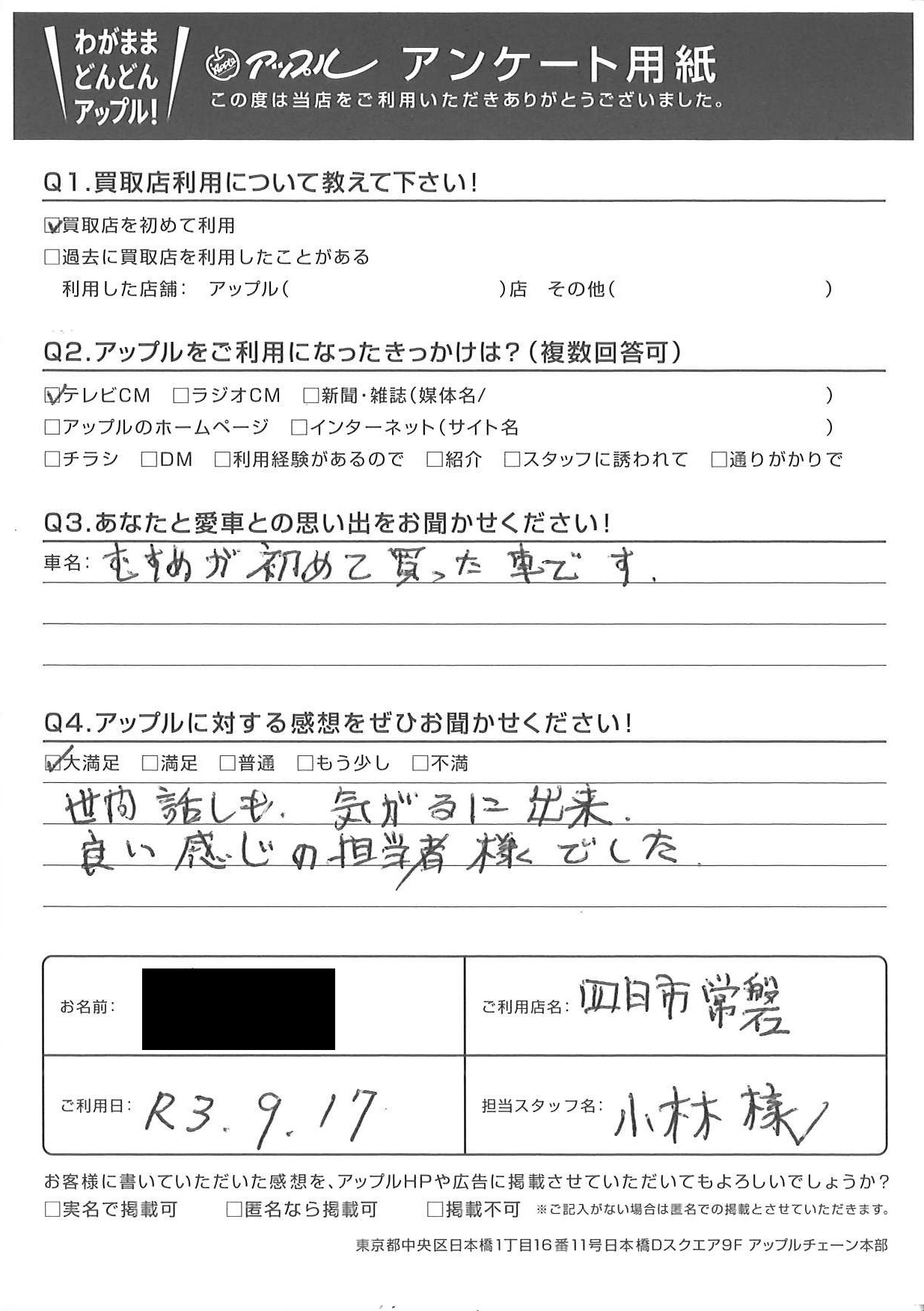 お車のご相談・ 査定だけでもOK! カンタン 入力 30秒 アップルがブランド買取始めました! お電話でも受付中! 受付時間10:00 ~ 18:30 0120-174-177 お車のご相談・ 査定だけでもOK! カンタン 入力 30秒 アップルがブランド買取始めました! お電話でも受付中! 受付時間10:00 ~ 18:30 0120-174-177 アップルがブランド買取始めました! お電話でも受付中! 受付時間10:00 ~ 18:30 0120-174-177 店舗情報 在庫車 スタッフ紹介 ブログ お客様の声 キャンペーン お得 無料査定 click お客様の声 ご記入日: 2021/09/17 T様 車名:ホンダ ライフ 世間話しも、気がるに出来良い感じの担当者様でした。 前へ 次へ お客様の声一覧を見る