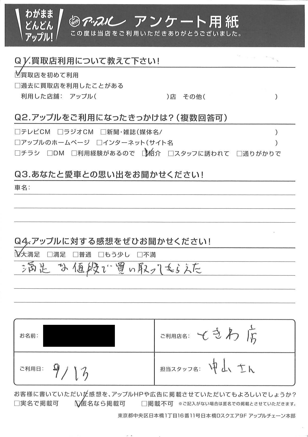 お車のご相談・ 査定だけでもOK! カンタン 入力 30秒 アップルがブランド買取始めました! お電話でも受付中! 受付時間10:00 ~ 18:30 0120-174-177 お車のご相談・ 査定だけでもOK! カンタン 入力 30秒 アップルがブランド買取始めました! お電話でも受付中! 受付時間10:00 ~ 18:30 0120-174-177 アップルがブランド買取始めました! お電話でも受付中! 受付時間10:00 ~ 18:30 0120-174-177 店舗情報 在庫車 スタッフ紹介 ブログ お客様の声 キャンペーン お得 無料査定 click お客様の声 ご記入日: 2021/09/13 H様 車名:トヨタ ヴェルファイア(H27年1月~のHYBRID含む) 満足な値段で買い取ってもらえた 前へ 次へ お客様の声一覧を見る