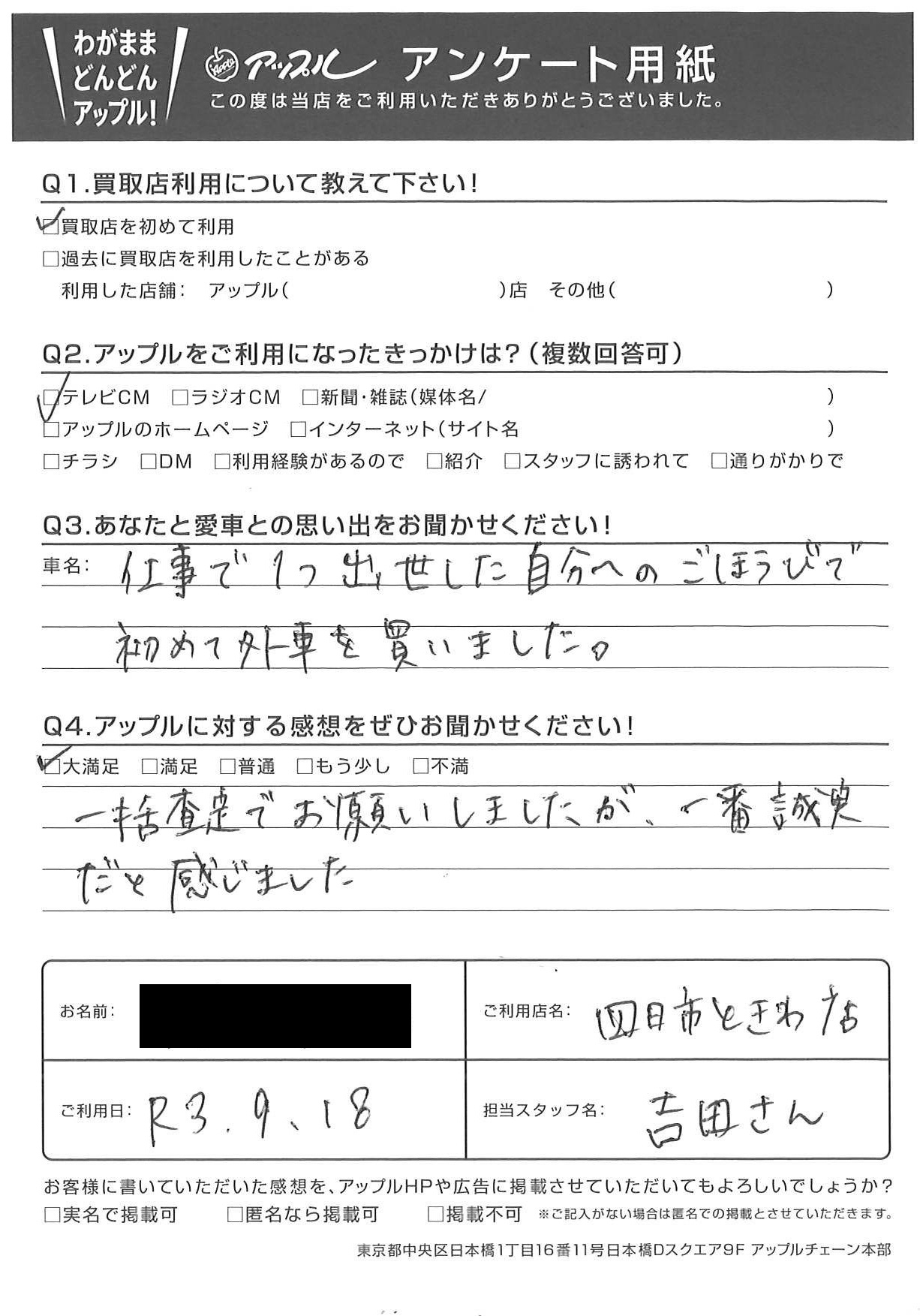 お車のご相談・ 査定だけでもOK! カンタン 入力 30秒 アップルがブランド買取始めました! お電話でも受付中! 受付時間10:00 ~ 18:30 0120-174-177 お車のご相談・ 査定だけでもOK! カンタン 入力 30秒 アップルがブランド買取始めました! お電話でも受付中! 受付時間10:00 ~ 18:30 0120-174-177 アップルがブランド買取始めました! お電話でも受付中! 受付時間10:00 ~ 18:30 0120-174-177 店舗情報 在庫車 スタッフ紹介 ブログ お客様の声 キャンペーン お得 無料査定 click お客様の声 ご記入日: 2021/09/18 S様 車名:プジョー 2008 一括査定でお願いしましたが、一番誠実だと感じました。 前へ 次へ お客様の声一覧を見る